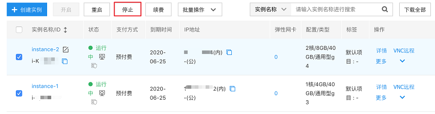停止多个实例:勾选您要停止的实例,在顶部单击 “停止”,如下图所示。