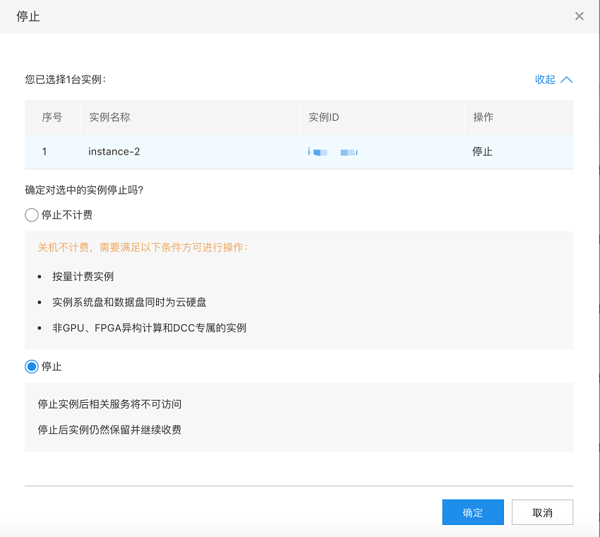 在弹出的 停止 对话框中,确认实例信息,勾选 停止,单击 确认 按钮,如下图所示。