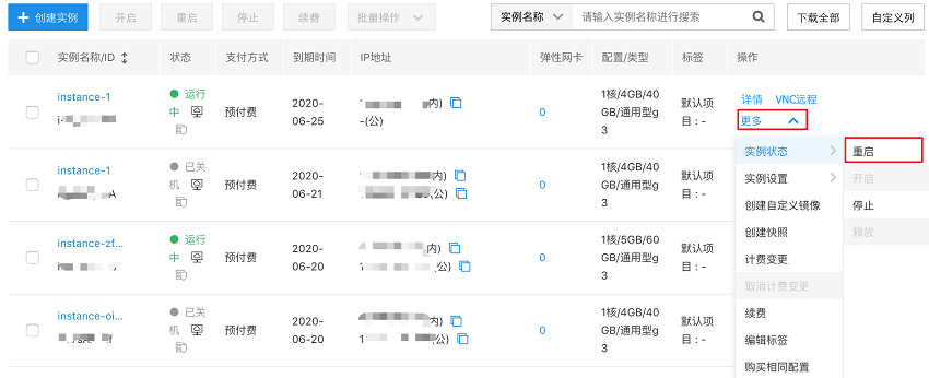 重启单个实例:选择您要重启的实例,在右侧操作列单击 “更多 - 实例状态 - 重启”,如下图所示。