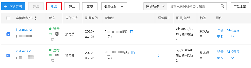 重启多个实例:勾选您要重启的实例,在顶部单击 “重启”,如下图所示。