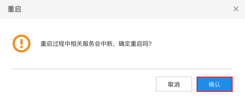 在弹出的 重启 提示框中单击 确认按钮,将云服务器重启,如下图所示。
