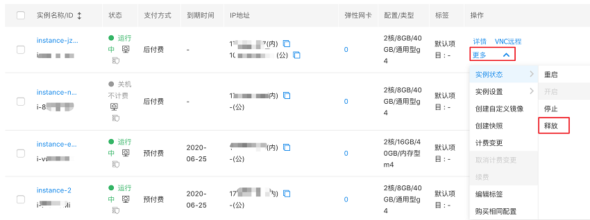 释放单个实例:选择您要释放的实例,在右侧操作列单击 “更多 - 实例状态 - 释放”,如下图所示。