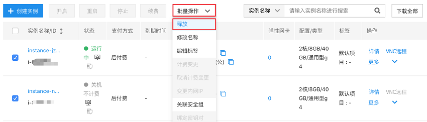 释放多个实例:勾选您要释放的实例,在顶部单击 “批量操作 - 释放”,如下图所示。