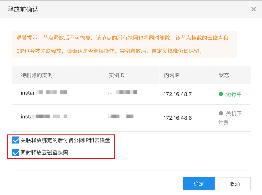 | 同时勾选 | 释放 | 预付费云磁盘卸载,后付费云磁盘释放 | 预付费公网IP解绑,后付费公网IP释放 |