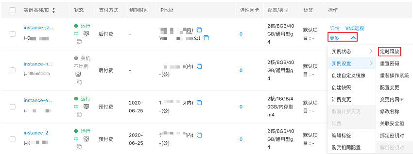 选择您要释放的 后付费类型 的实例,在右侧操作列单击 “更多 - 实例设置 - 定时释放”,如下图所示。