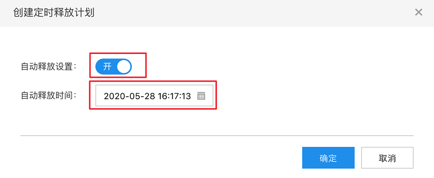 在弹出的 创建释放计划 对话框,选择开启 自动释放设置 ,并在 自动释放时间 项,选择您要释放的时间,精确到秒,单击 确定,如下图所示。