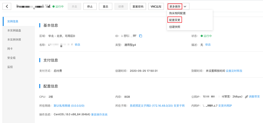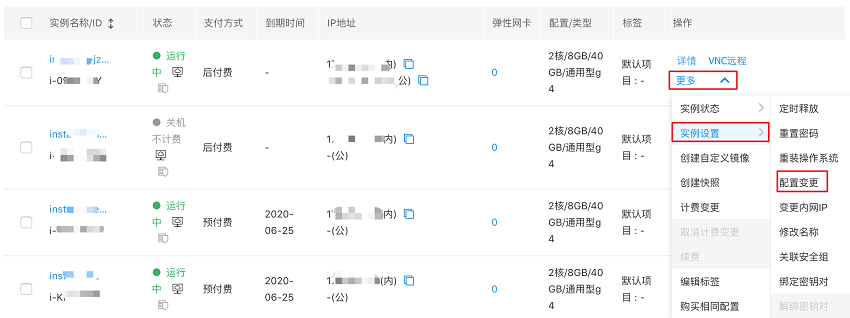 在实例详情页中,单击 “更多操作 - 配置变更”,如下图所示。