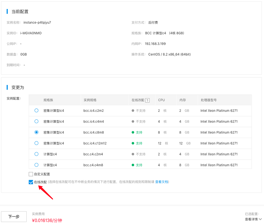 - 在配置变更页,选择相应的配置,点击 “下一步”,并完成相应支付。