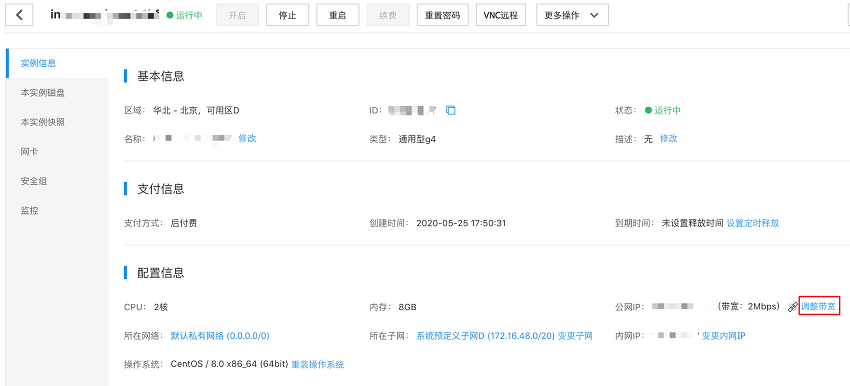 选择要调整带宽的实例,并点击实例名称进入“实例详情”页签,点击“调整带宽”,如下图所示。