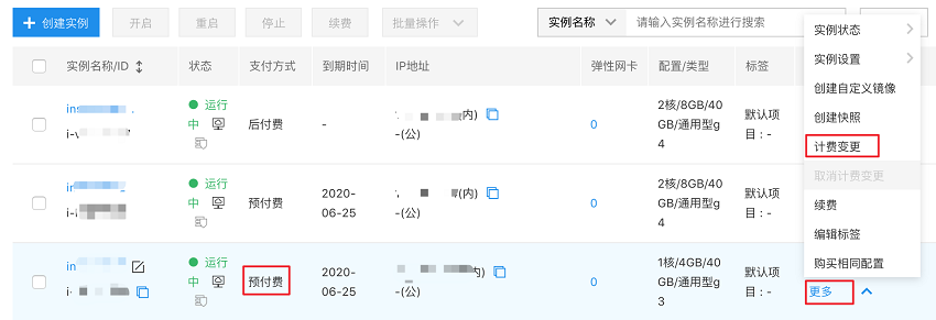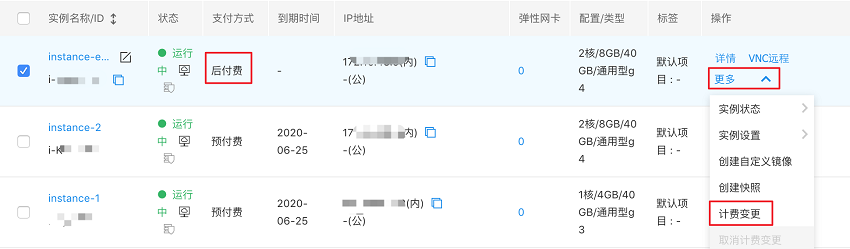 - 单个实例计费变更:选择要变更的后付费实例,在右侧的操作栏,单击 “更多 - 计费变更”,如下图所示。
