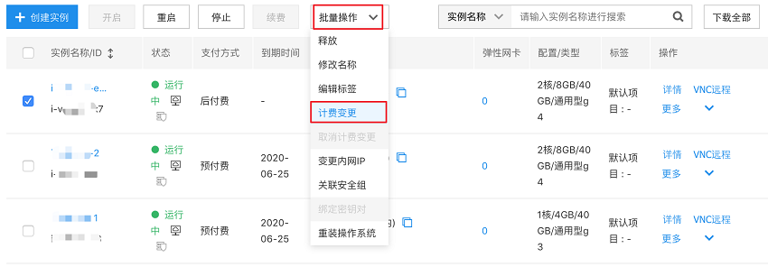 - 多个实例计费变更:勾选要变更的后付费实例,点击顶部的 “批量操作 - 计费变更”,如下图所示。