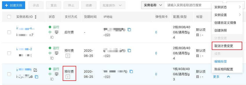 选择正在由预付费转后付费的实例,在右侧操作栏,单击 “更多 - 取消计费变更”,如下图所示。