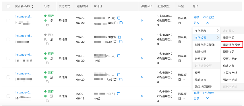 方式一:在实例列表页选择要重装系统的实例,单击操作栏下的“更多 - 实例设置 - 重装操作系统”,如下图所示。