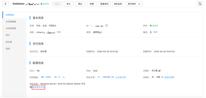 方式二:在“实例名称”列,选择该云服务器的ID链接,进入“实例详情”页面。点击页面中的“重装操作系统”,进行系统的重装,如下图所示。