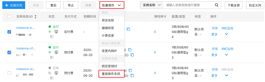 在实例列表页勾选您要重装系统的操作实例,点击“批量操作 - 重装操作系统”,如下图所示。