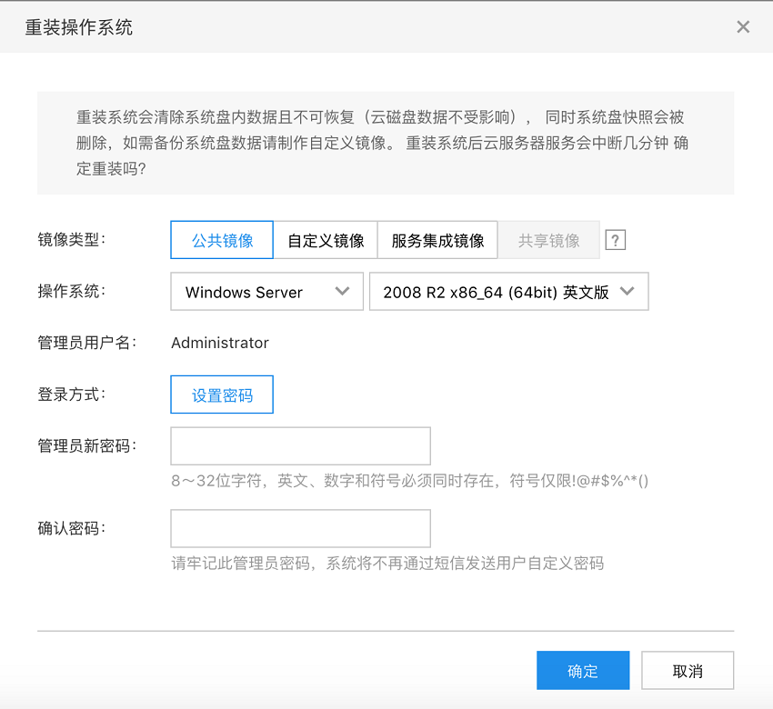 在弹出的 “重装操作系统” 窗口中,选择您要使用的镜像类型及操作系统,设置密码,点击 确定。
