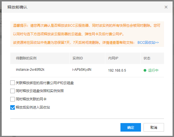 | 同时勾选 | 和实例一起进入回收站 | 预付费云磁盘卸载,后付费云磁盘释放 | 预付费公网IP解绑,后付费公网IP释放 |