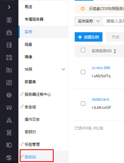 在跳转的 回收站列表 页面上,如下图所示,可以看到目前已经进入回收站的BCC实例。