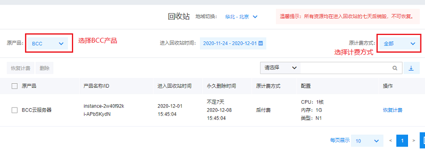 登录 云服务器BCC控制台 进入实例列表页面。选择左侧导航栏的 回收站 标签,点击进入回收站列表页。点击对应的实例后面 恢复计费 按钮,如下图所示。