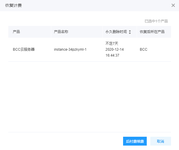点击弹窗中的 后付费续费 按钮,确认恢复计费,如下图所示。