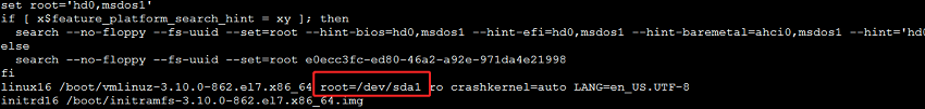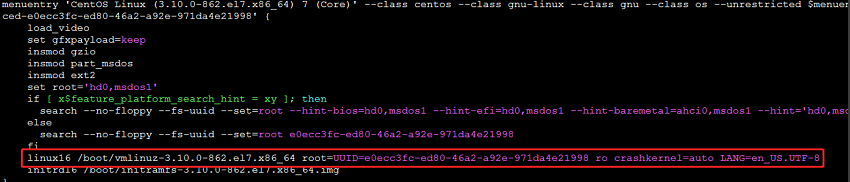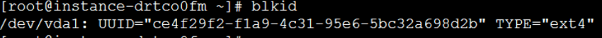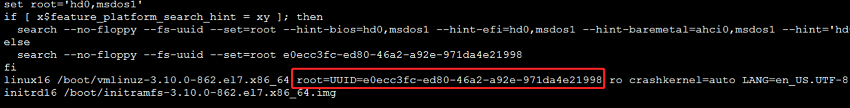 如果显示为root=/dev/方式,则需要通过blkid命令查询对应磁盘分区的UUID,然后在/boot/grub2/grub.conf文件中修改为root=UUID=ID的形式。