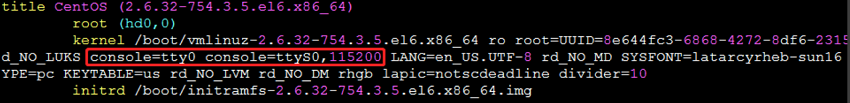 注意对于centos6系统,console=tty0 console=ttyS0,115200也需要在root参数后面,如下图所示