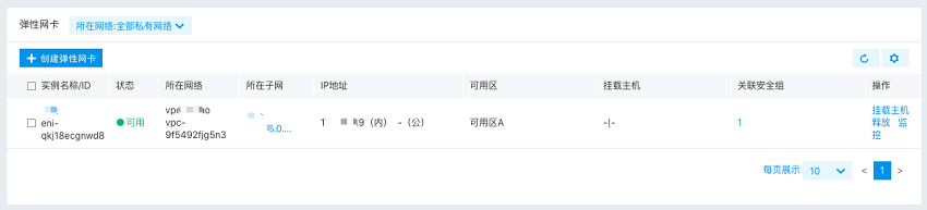 弹性网卡创建成功后,您可以执行挂载弹性网卡。