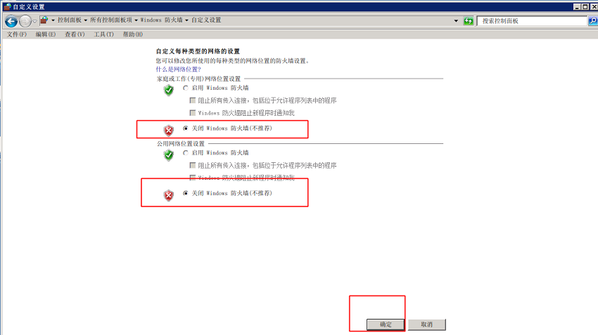 4.选择关闭windows防火墙点击确定