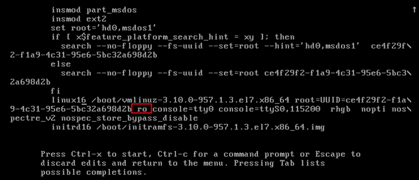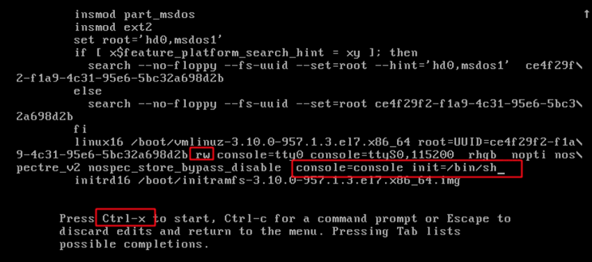2.找到第一个linux16部分,修改ro为rw,在末尾后面添加console=console init=/bin/sh