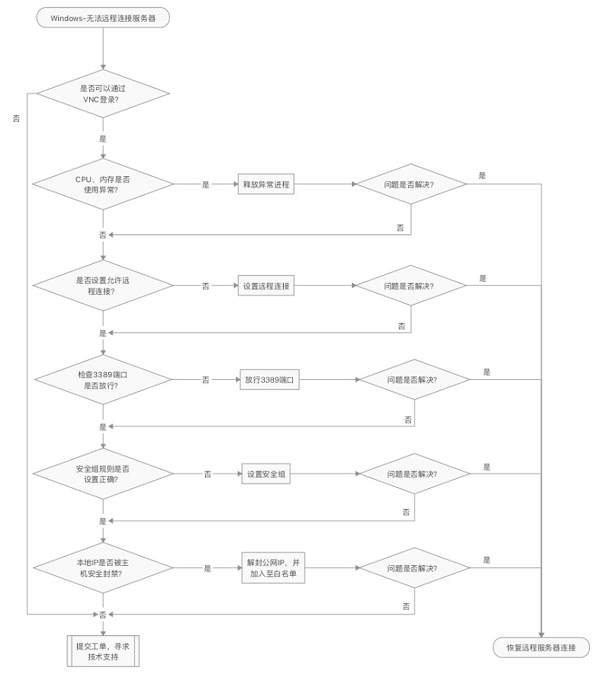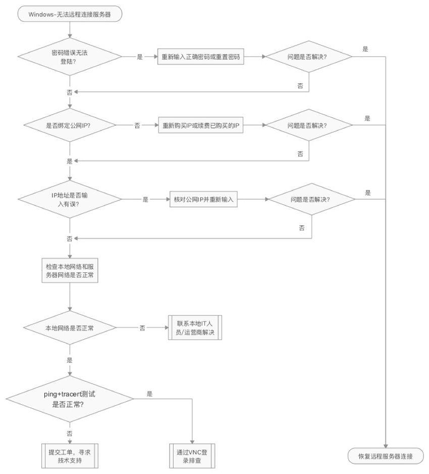 当您无法通过远程连接软件登陆Windows实例时,推荐您先进行本地检测确认本地环境正常。若未解决问题,可通过VNC登录的方式登录云服务器逐步排查故障。