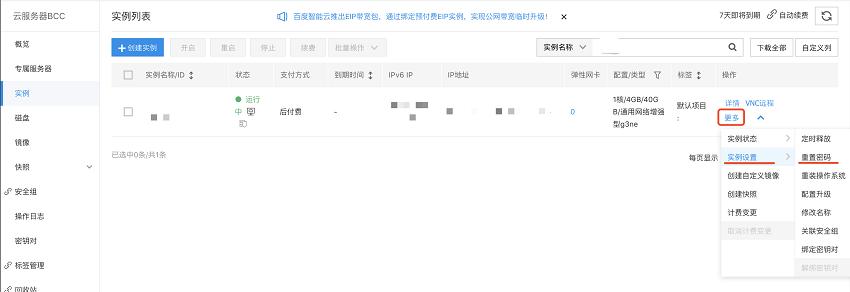 - 找到实例,点击右侧的“更多”,选择实例设置-重置密码,需要注意的是:执行重置密码操作会强制重启服务器,建议在业务低峰期执行