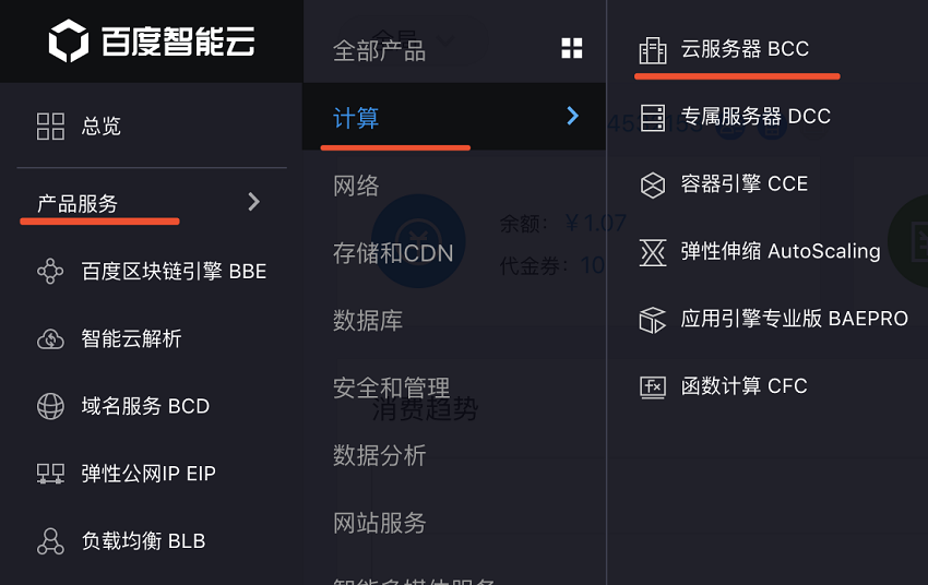 - 登录百度智能云控制台,选择产品服务-计算-云服务器BCC