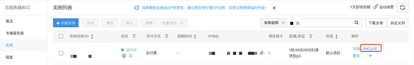 - 找到无法远程连接的实例,点击右侧的VNC远程