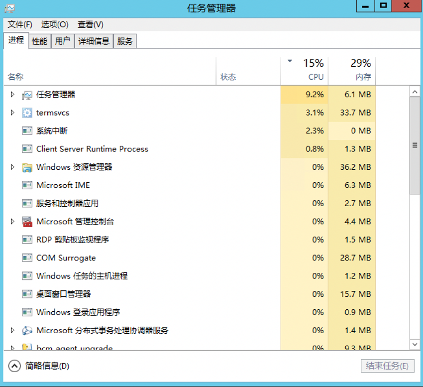 - 查看当前CPU、内存的使用情况,如果某进程占用大量资源,可以在做好快照的前提下,先结束该进程,然后再观察是否可以远程连接,如果无法远程连接,可以继续按照如下步骤排查。