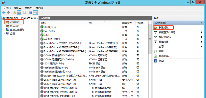 - 点击入站规则->新建规则。