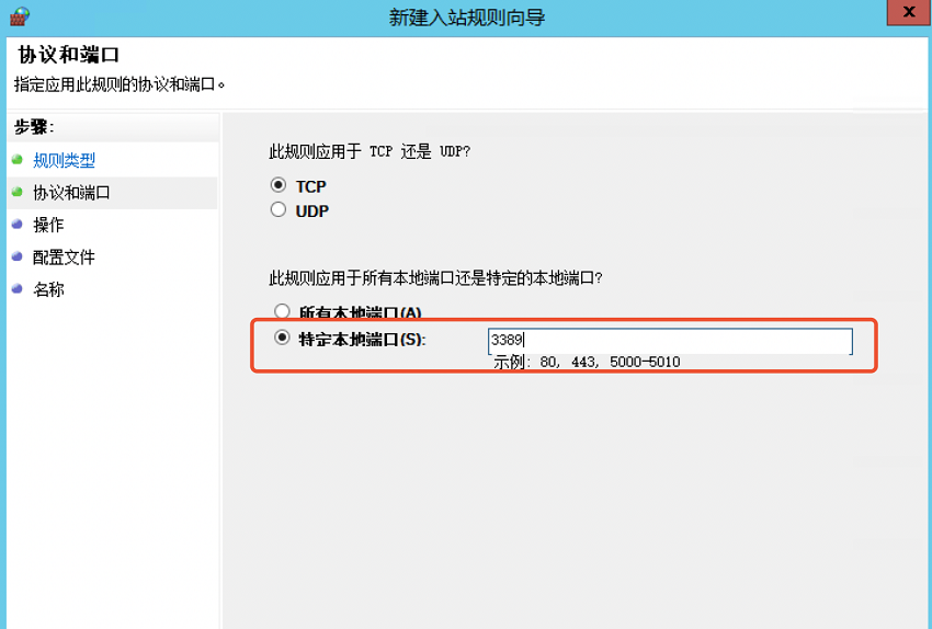 - 选择端口,添加3389