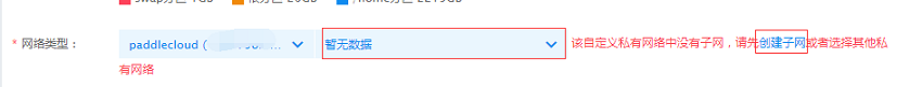 在用户选择BBC配置信息的网络类型时,如果用户的私有网络下没有可用子网,会出现下图提示。此时,您需要执行创建子网操作。