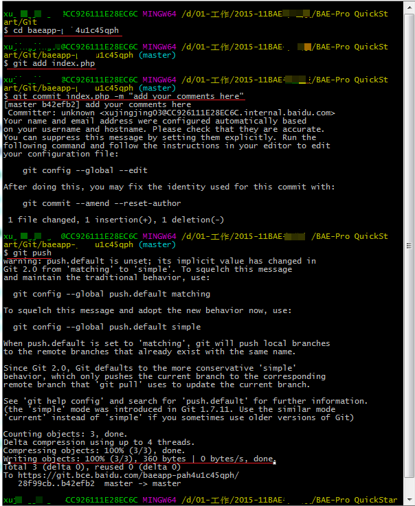 本节介绍通过git进行版本管理的具体操作,以下操作基于“BAE专业版部署Helloworld(SVN)”中所描述的场景。