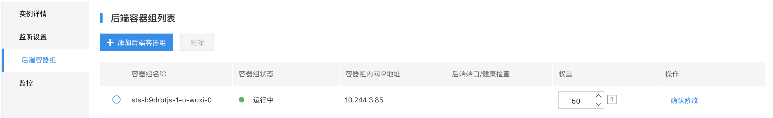 - 在实例详情页,点击“后端服务器”,进入后端容器组列表页。