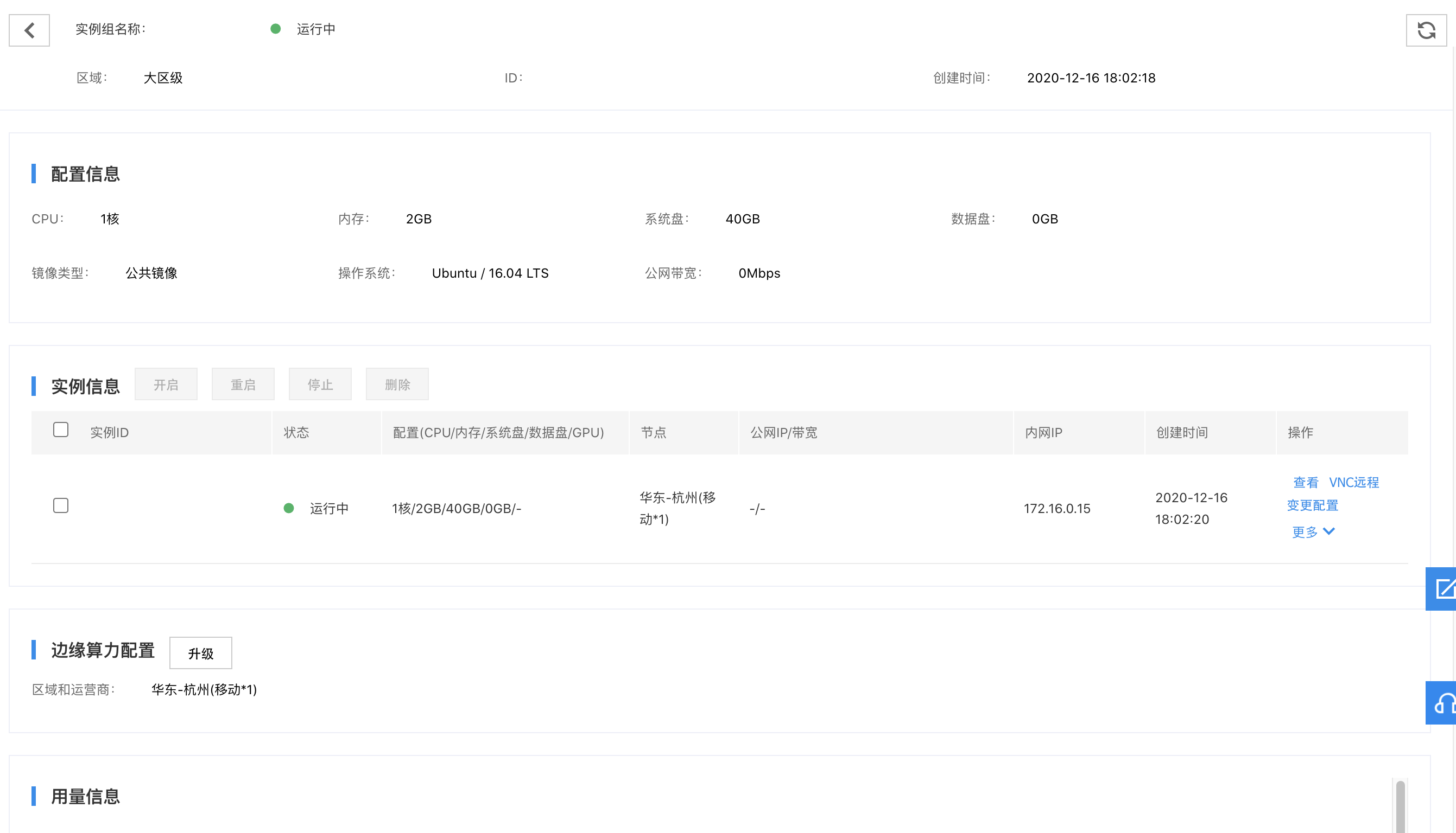 在实例组列表,可以查看实例组的详细信息。在实例组详情页可以看到实例组配置信息、实例信息、已购节点信息和用量信息。