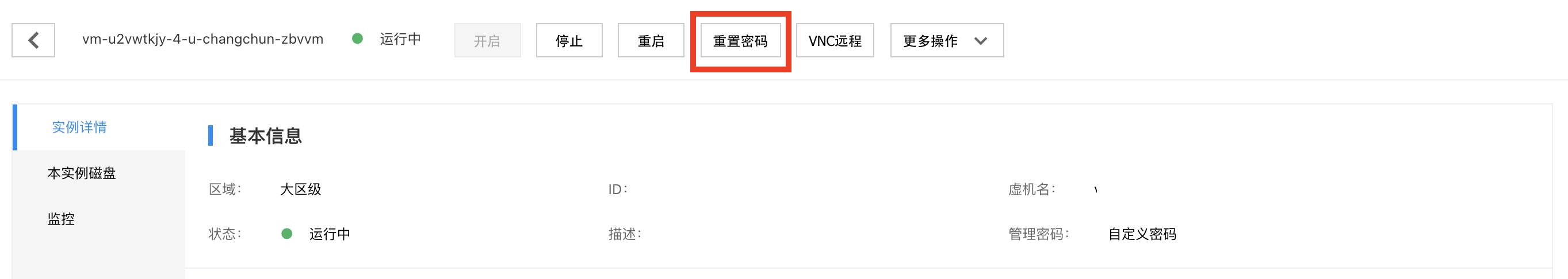 - 重置密码会重启服务器,导致服务器停止几分钟。为保证您的服务不受影响,请谨慎操作。