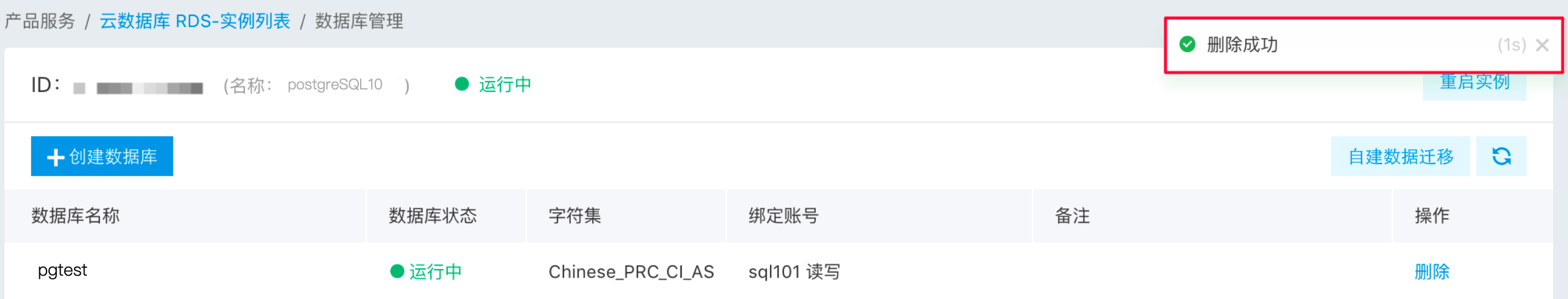 - 在“数据库管理”子页面,点击要删除数据库对应操作列的删除链接,点击确定按钮。