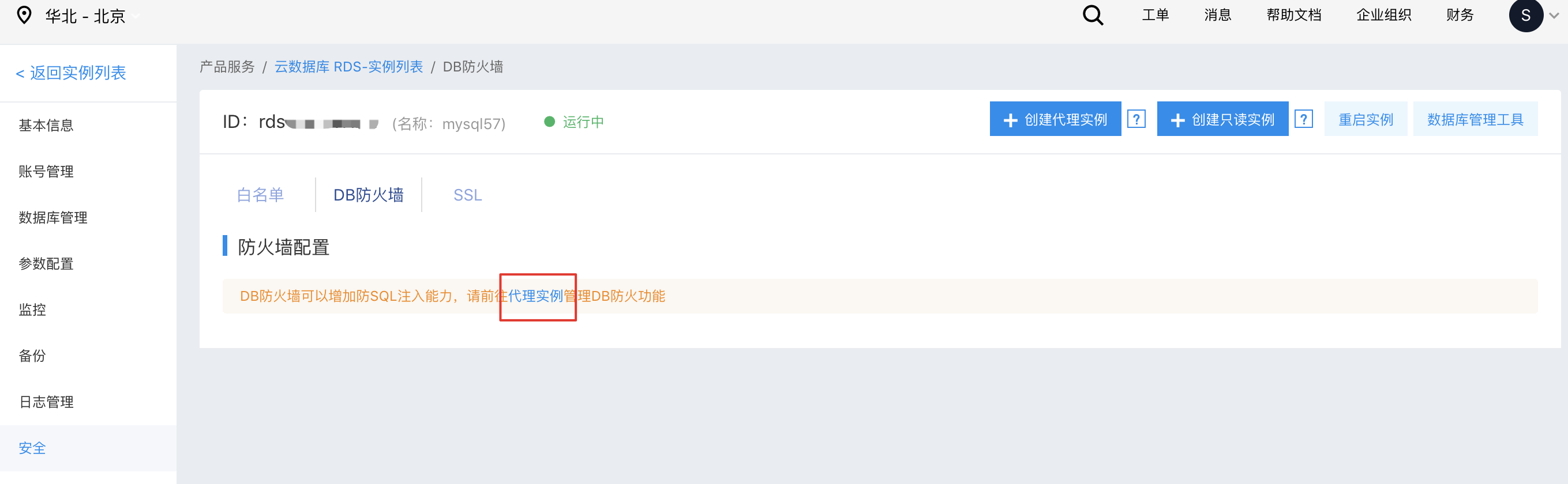 - 在左侧导航栏中单击安全,在“安全”页面选择 DB 防火墙页签,进行 DB 防火墙设置。