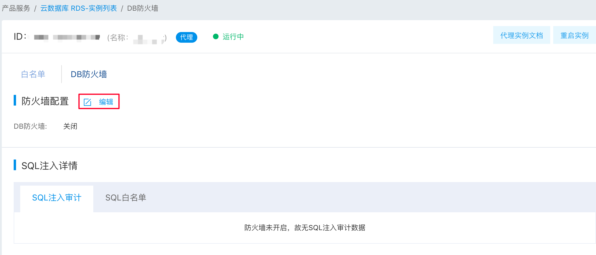 在代理实例的DB 防火墙页签下点击“编辑”按钮管理 DB 防火墙功能。
