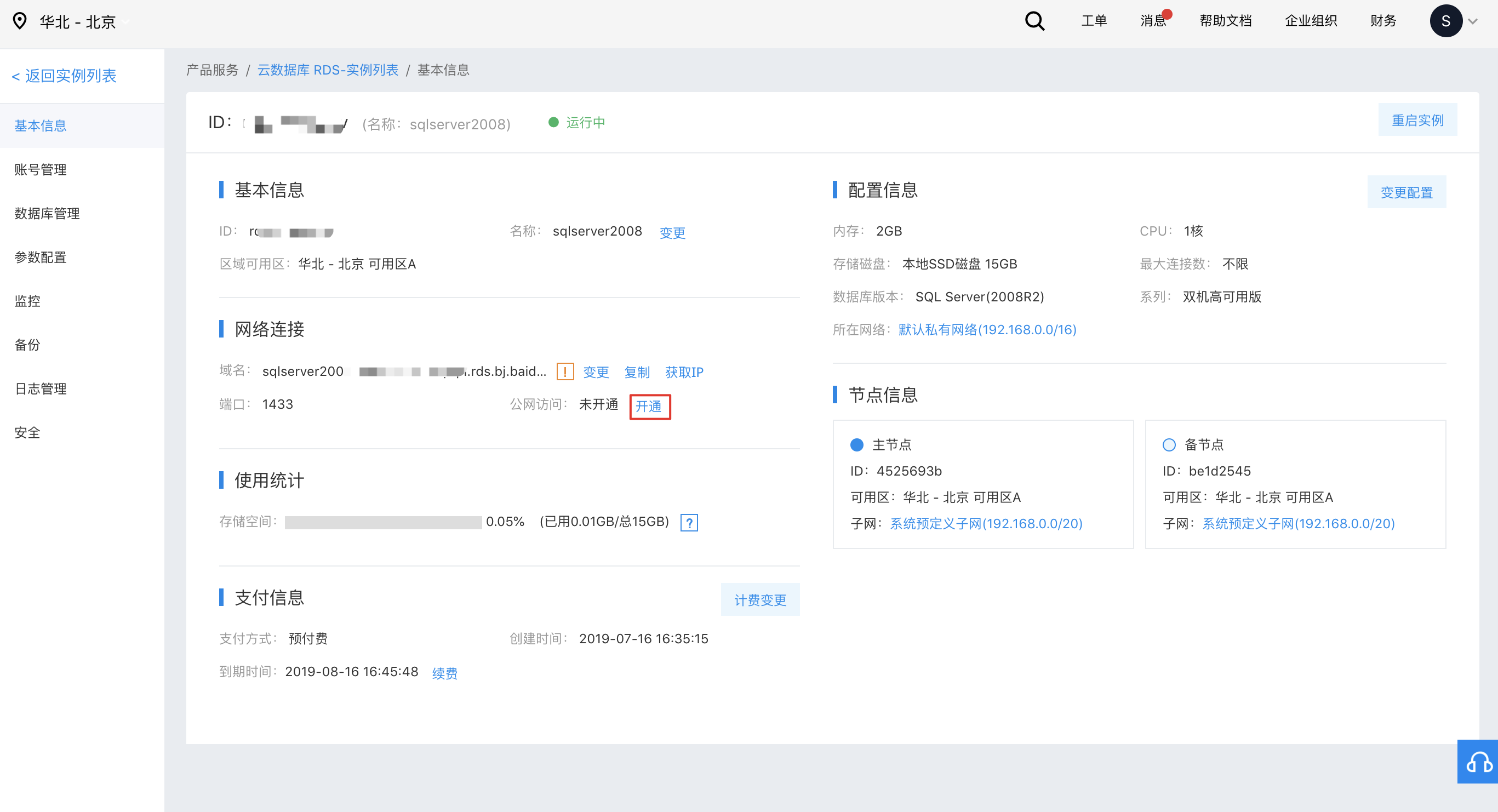 - 在“基本信息”页面点击公网访问后面的开通,等待系统处理完成开通即可。