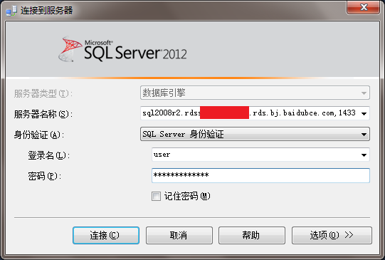 在弹出的“连接到服务器”对话框“服务器名称”中输入云数据库 RDS 实例内/外网地址和端口号,在“登录名”和“密码”中分别输入数据库账号和密码。