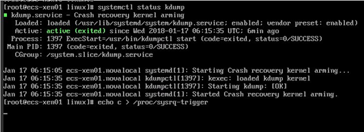 采用XEN虚拟化技术的Linux弹性云主机,发生kdump时系统卡住无响应,不能自动重启恢复。例如,用户执行命令echo c>/proc/sysrq-trigger主动触发kdump功能,Linux弹性云主机卡住,如下图所示。