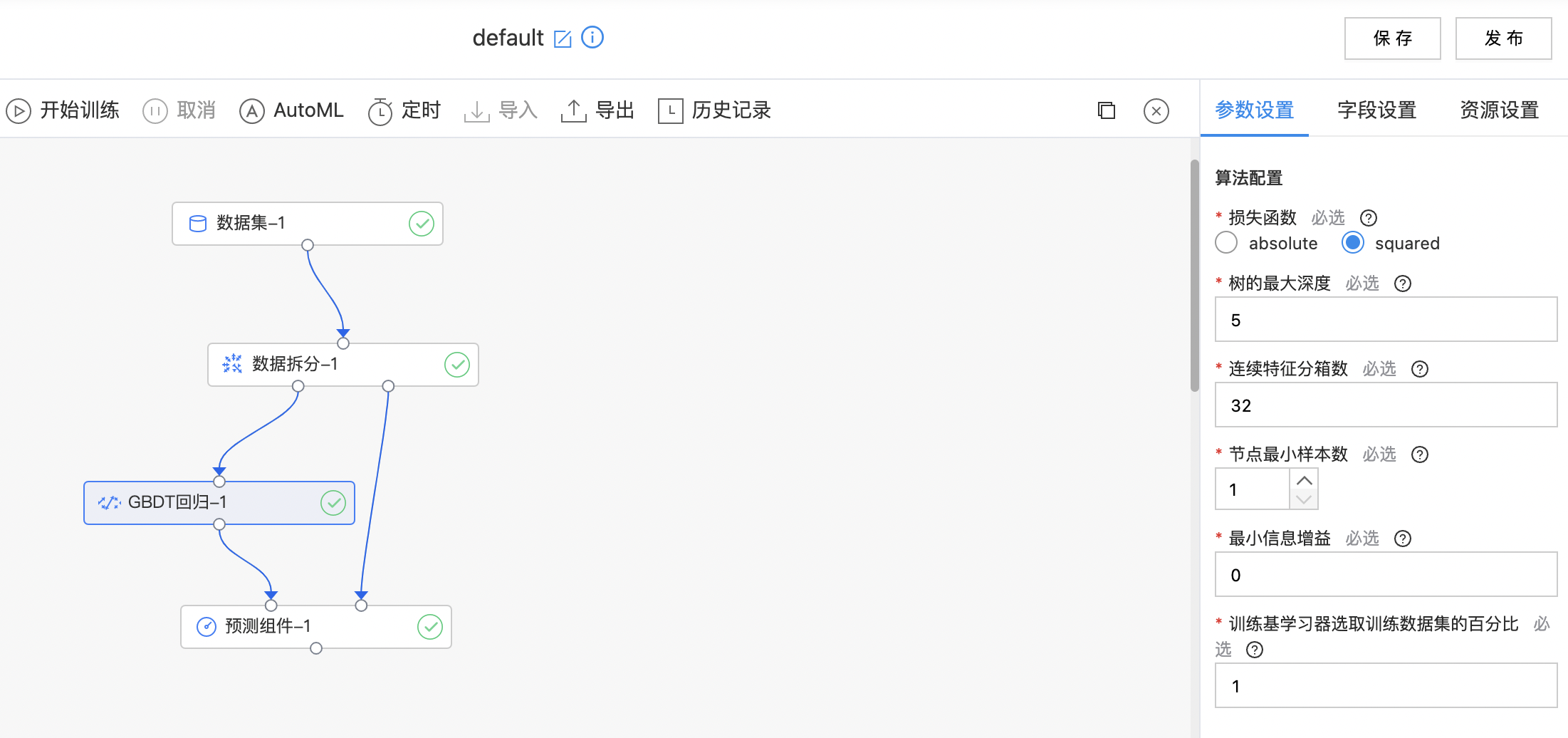 | 连续特征分箱数 | 是 | 连续特征的最大分箱数 范围:[2, inf)。 | 32 |