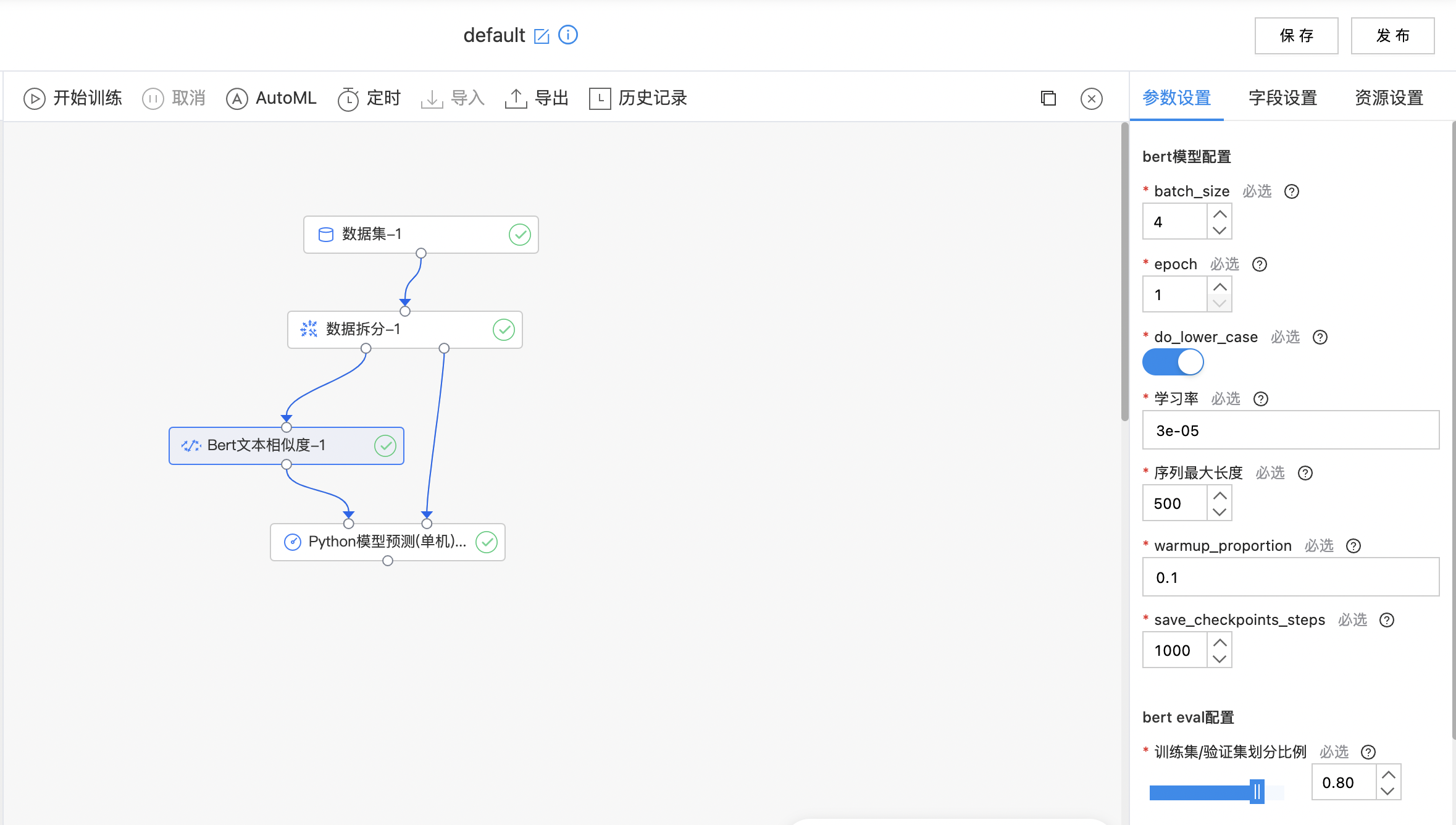 | do_lower_case | 是 | 输入文本是否小写, 对于中文文本应当设置为True。 | 开启 |