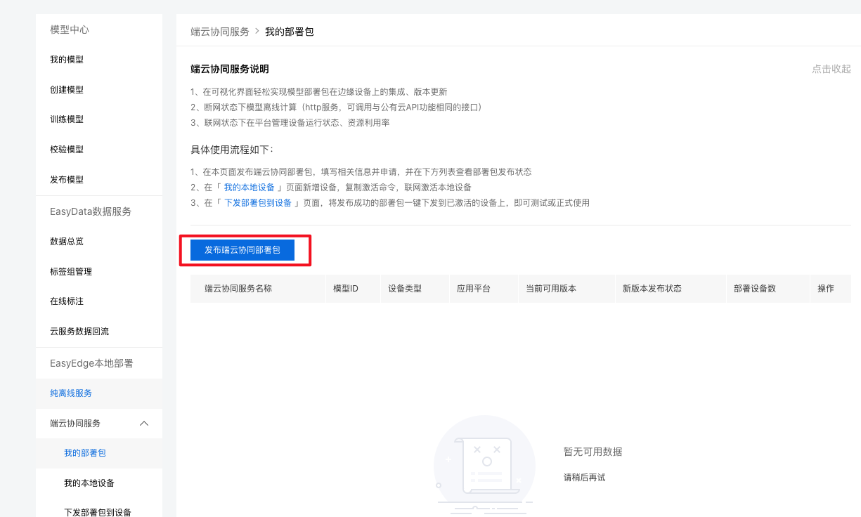 在我的部署包页面可以进行已发布的模型部署包的管理。